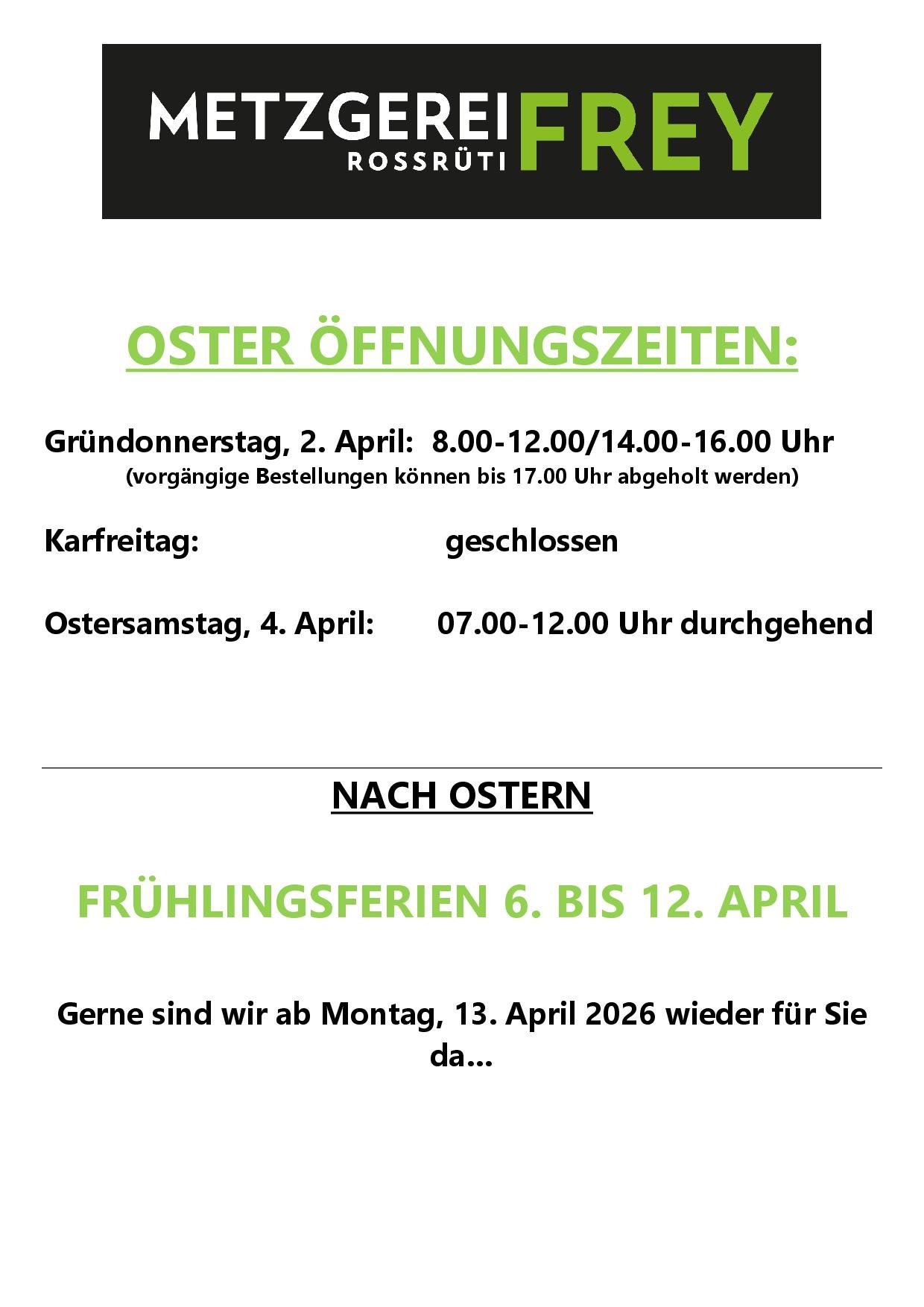 Ostersamstag: 7.00-12.00 Uhr durchgehend